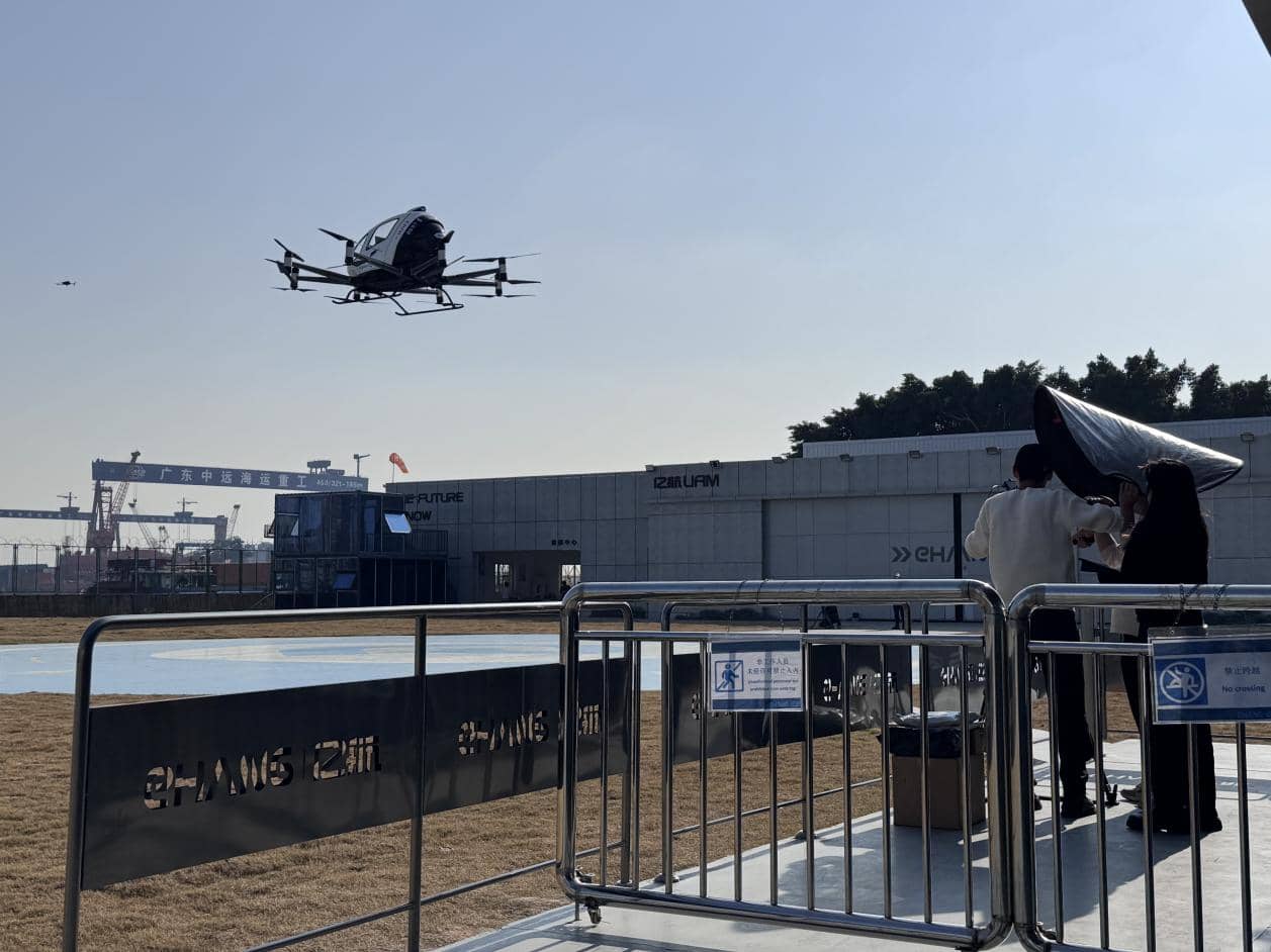 摄制组拍摄主持人试乘亿航智能公司无人驾驶飞行器