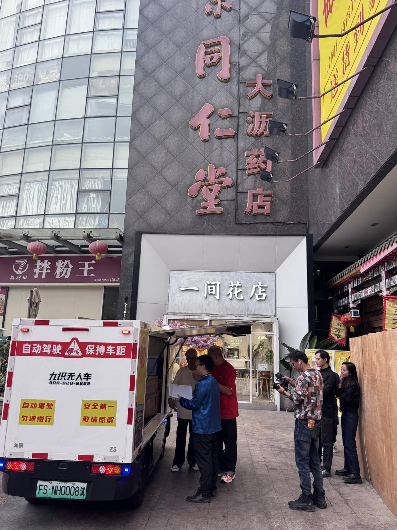 摄制组拍摄九时智能无人驾驶送货车,摄制组一路跟拍该车辆从同仁堂库房送货到药房装货、行驶、卸货等全流程