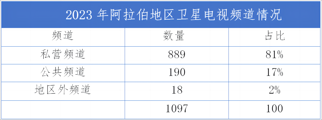 截至2023年底,阿拉伯地区共有卫星电视频道1097个,其中阿拉伯本土公共频道190个,占比17%;私营频道889个,占比81%;阿拉伯地区外的公共频道18个,占比2%。