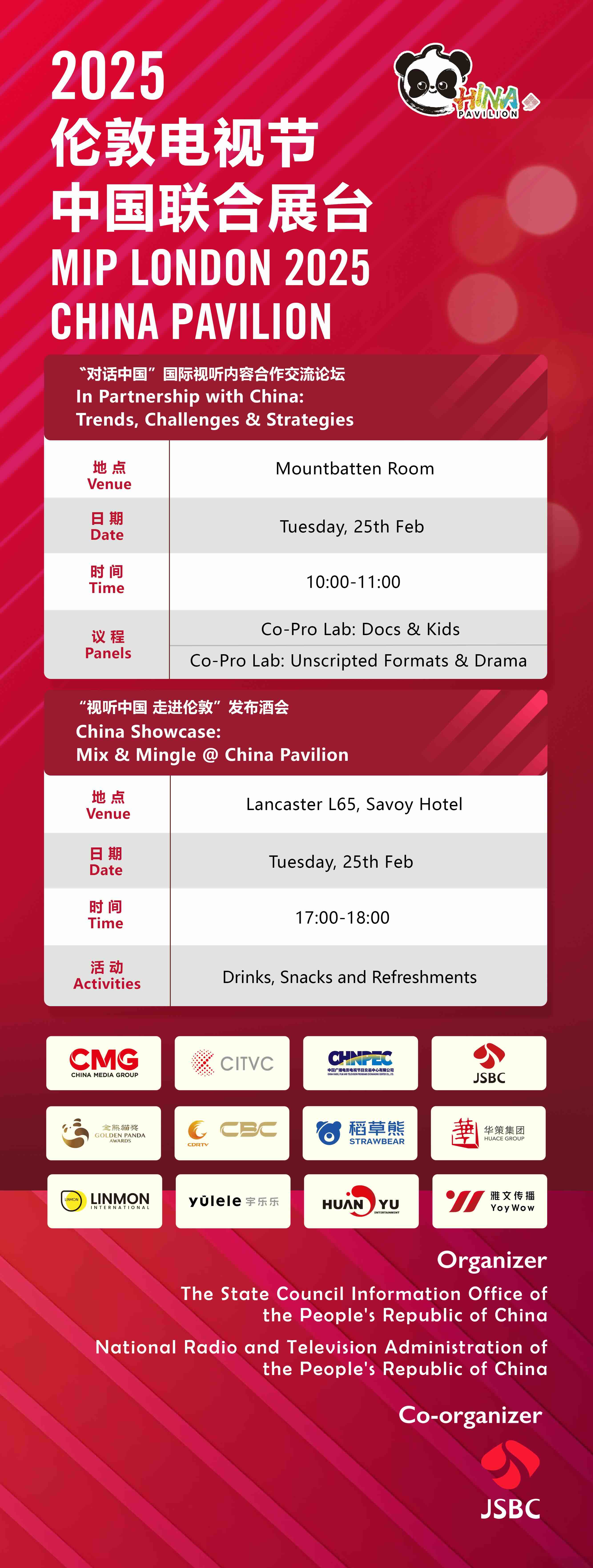 英国当地时间2月23日,首届伦敦电视节(MIP LONDON)即将拉开帷幕。由国务院新闻办公室、国家广播电视总局指导,江苏广电国际传播有限公司承办的“中国联合展台”系列活动即将亮相伦敦泰晤士河畔,敬请期待!