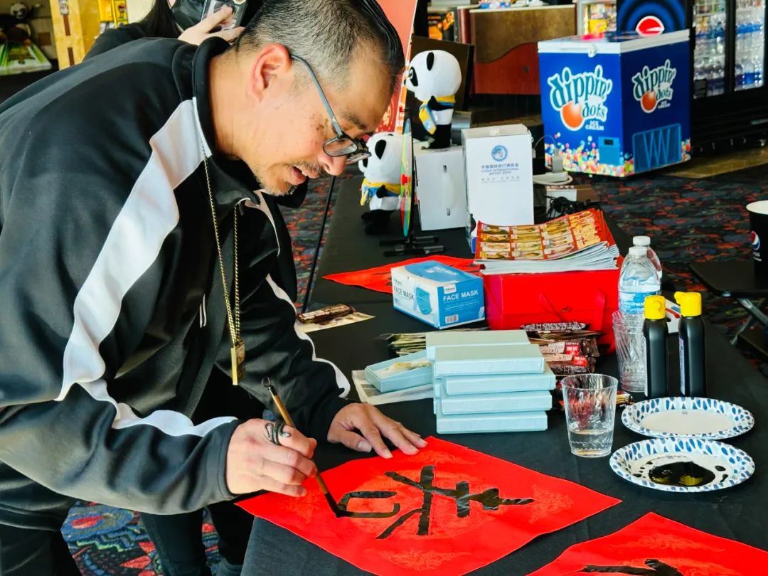 影院的工作人员兴致勃勃的现场学习中国书法,感受新春气氛。